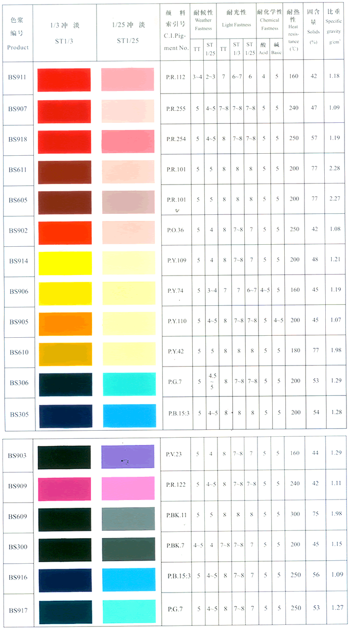 3、本公司的BS911和BS906由于其結(jié)構(gòu)較簡(jiǎn)單,在做淺色的情況下耐候性較差(具有價(jià)格優(yōu)勢(shì)),所以此二產(chǎn)品只適用于做深色外墻,建議用量3%以上,淺色宜用我公司其它牌號(hào)的色漿調(diào)制。